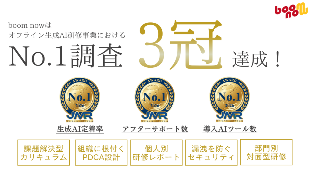株式会社boom nowが提供する企業向け生成AI研修サービス「SHISUKANSU」は、日本マーケティングリサーチ機構による2026年4月期の市場調査において、「生成AI定着率No.1」「導入AIツール数No.1」「アフターサポート数No.1」の3部門でNo.1を獲得しました。SHISUKANSUは、単に生成AIの操作方法を学ぶだけでなく、企業ごとの業務課題に合わせたカリキュラム設計から、現場で使い続けるための定着支援、さらには実務改善やシステム実装につながる伴走支援までを一気通貫で行う実践型研修サービスです。boom nowでは、企業向け研修サービスに加え、AIを取り入れたシステム開発も展開しており、研修と実装を接続できる点も特長のひとつです。